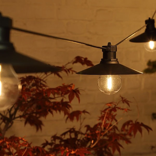 - Stylish saucer-shaped festoon lights with 6 warm white LED bulbs